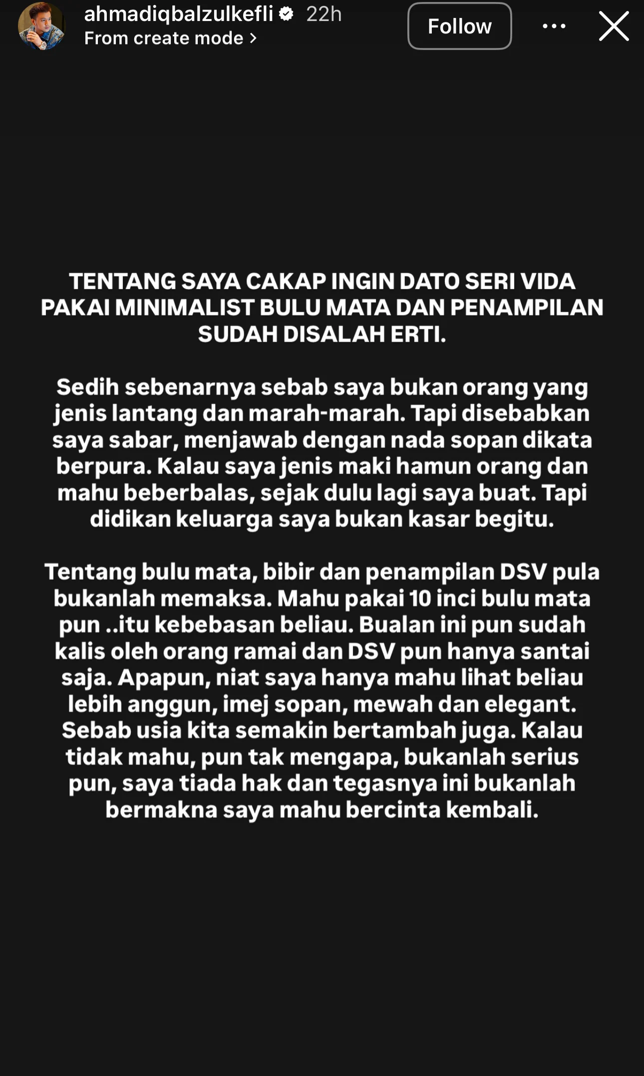 Apapun, niat saya hanya mahu lihat beliau lebih anggun, imej sopan, mewah dan elegan. Sebab usia kita semakin bertambah juga. Kalau tidak mahu, pun tidak mengapa, bukanlah serius pun, saya tiada hak dan tegasnya ini bukanlah bermakna saya mahu bercinta kembali.”-jelas Iqbal di Insta Story
