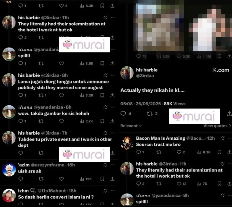 Pengguna nama @3irdaa di X mengatakan, “They literally had their solemnization at the hotel I work at but ok,”. tambahnya lagi, “Lama jugak diorang tunggu untuk announce publicly sebab they married since August.”