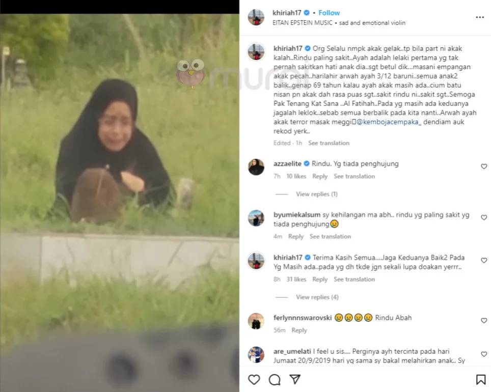 Pelakon, Noorkhiriah menerusi hantaran di Instagram meluahkan rasa sebak ketika menziarahi pusara arwah bapanya, Allahyarham Ahmad Shapie di kampung halaman.