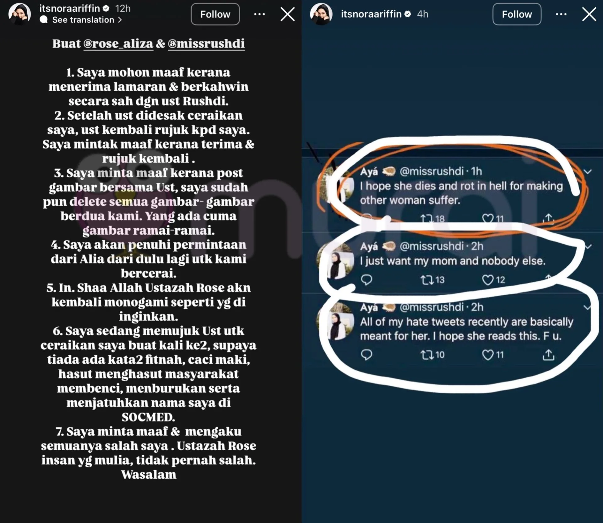 Nora menerusi hantaran di Insta Stories, turut memohon maaf kerana berkahwin secara sah dengan Dr Rushdi Ramli. Malah, dia juga sedang memujuk suaminya itu untuk menceraikannya buat kali kedua agar tiada lagi fitnah dan caci maki mengenainya di media sosial.