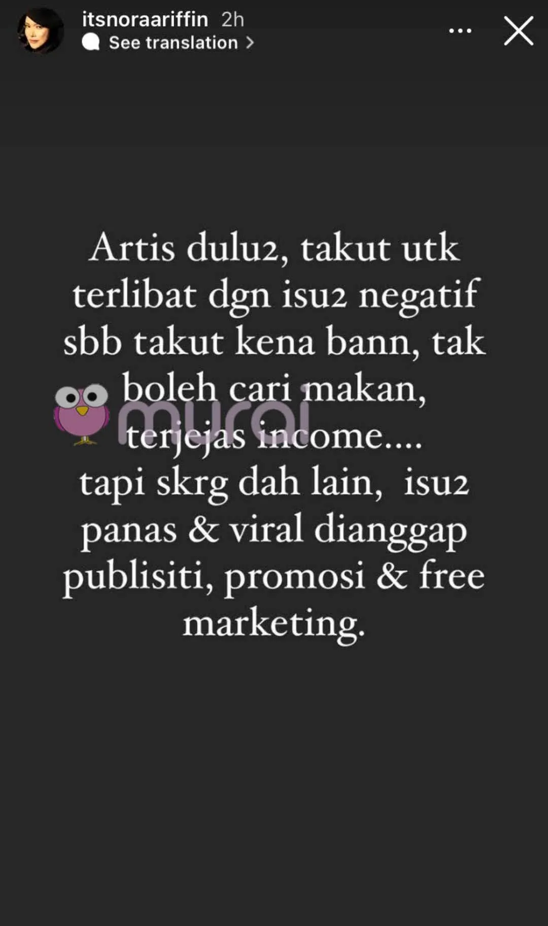 Menerusi Insta Stories, Nora menceritakan bahawa selebriti pada zaman dahulu sangat takut untuk terlibat dengan perihal yang negatif kerana ia boleh menjejaskan pendapatan mereka.