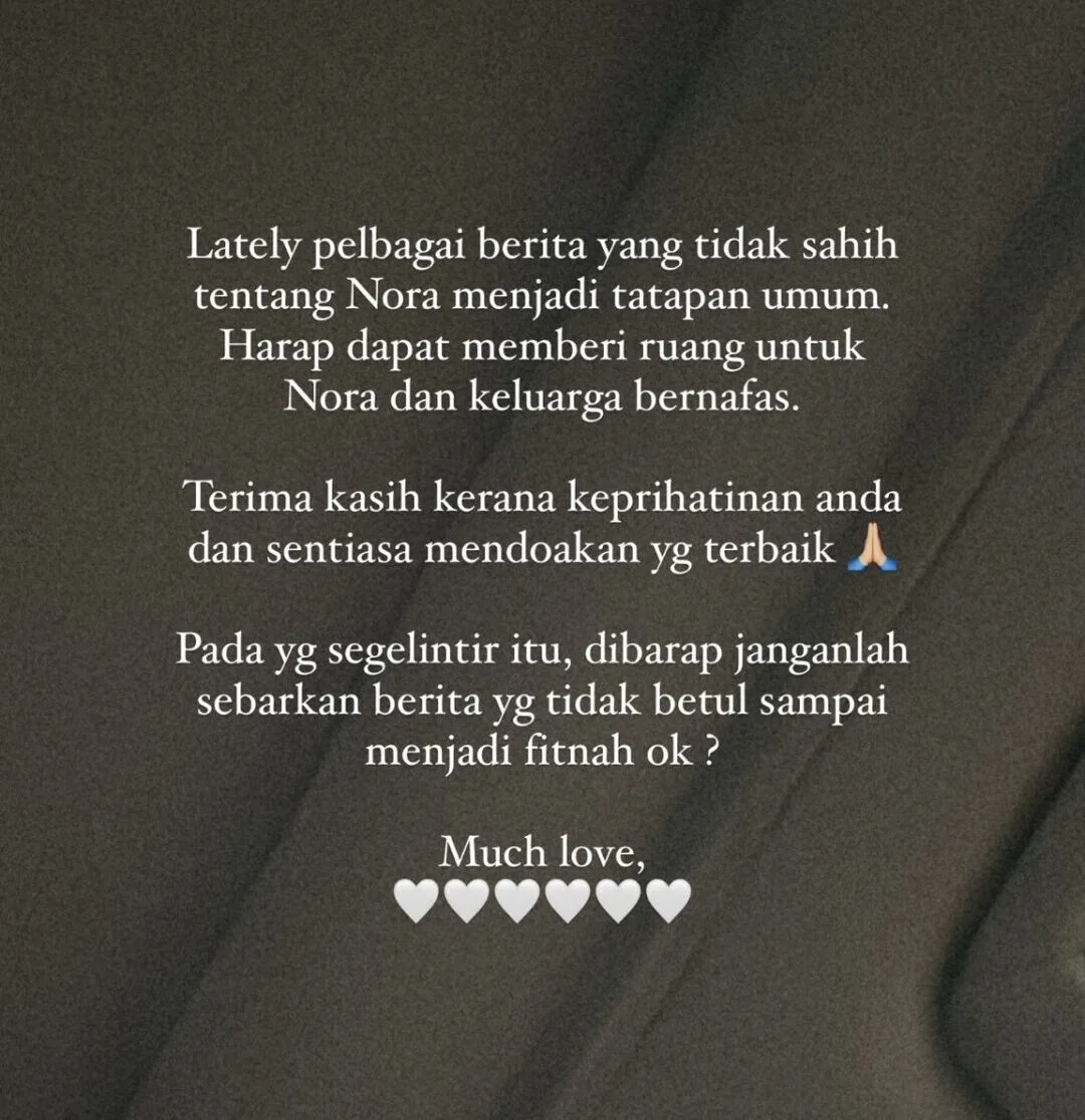 “Lately pelbagai berita yang tidak sahih tentang Nora menjadi tatapan umum. Harap dapat memberi ruangan untuk Nora dan keluarga bernafas.