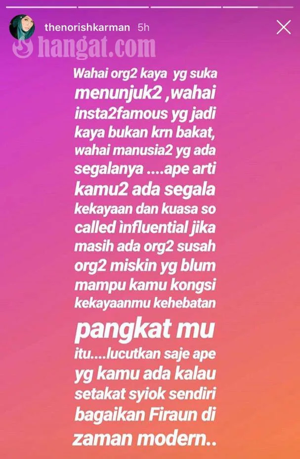 “Wahai orang-orang kaya yang suka menunjuk-nunjuk, wahai para instafamous yang jadi kaya bukan kerana bakat, wahai manusia-manusia yang ada segalanya… apa erti kamu semua yang ada segala kekayaan dan kuasa ‘so calles influential’ jika masih ada ramai orang susah, miskin yang belum mampu kamu kongsi kekayaan kehebatan pangkatmu itu! Lucutkan saja apa yang kamu ada kalau setakat syok sendiri bagaikan Firaun di Zaman Moden”- katanya di IG Stories