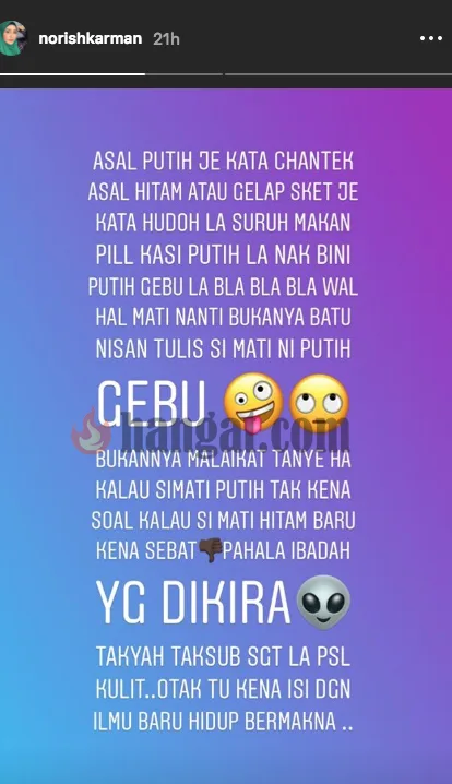 Ketaksuban untuk kelihatan putih telah menyebabkan ramai antaranya mengabaikan aspek lain yang lebih penting iaitu kecantikan keperibadian. Hal ini turut disedari oleh pelakon Norish Karman yang bimbang dengan masyarakat terlalu terikut-ikut dengan trend kulit putih sehingga memberi impak negatif pada diri sendiri.