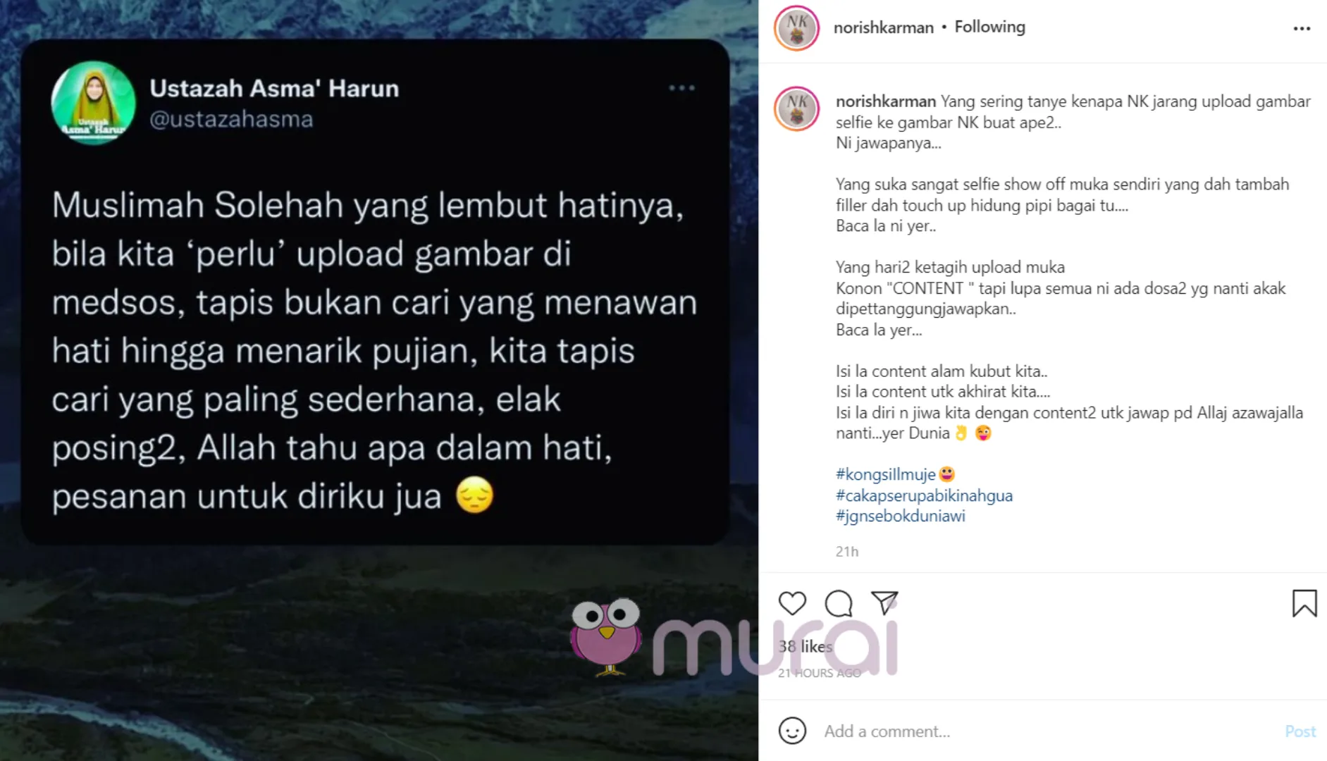 “Muslimah solehah yang lembut hatinya, bila kita perlu upload gambar di media sosial, tapis bukan cari yang menawan hati hingga menarik pujian,