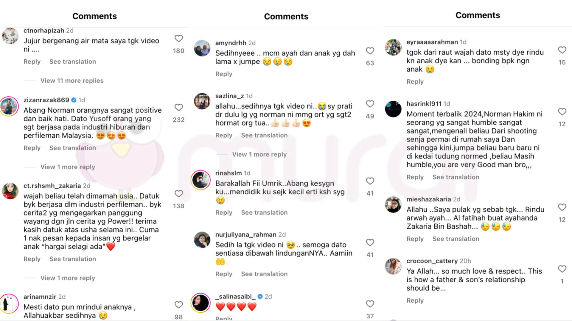 Menitipkan doa agar Yusof Haslam sentia berada di bawah lindunganNya, perkongsian Norman turut mencetuskan rasa sebak netizen yang melihat kemesraan antara Norman dan Yusof Haslam yang benar-benar kelihatan seperti bapa dan anak yang sudah lama tidak bertemu.