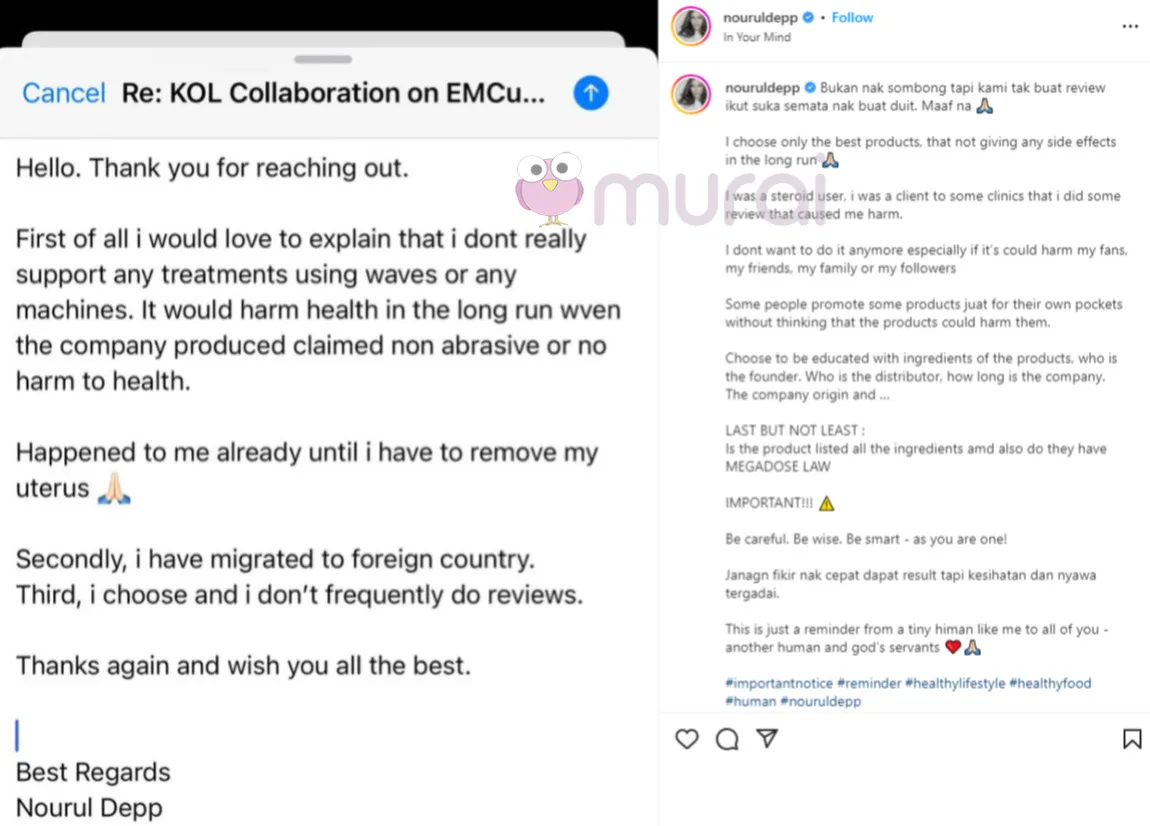 Jelas Nourul menerusi hantaran di Instagram, dia tidak melakukan review semata-mata untuk mendapatkan keuntungan, sebaliknya memilih produk terbaik yang tidak memberikan kesan sampingan untuk jangka masa panjang.