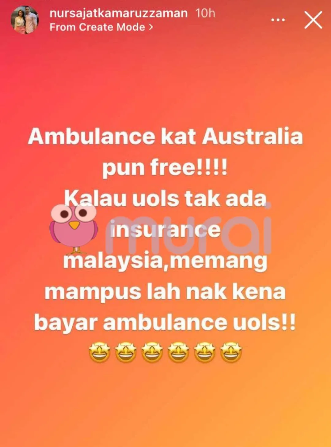 “Ambulance kat Australia pun free!!! Kalau uols tak ada insurance Malaysia, memang mampus lah nak kena bayar ambulance uols!!”- katanya lagi