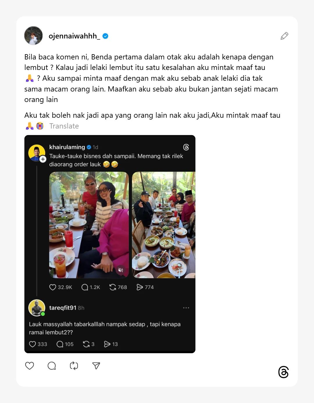 “Lauk masyaAllah Tabarakallah nampak sedap, tapi kenapa ramai lembut-lembut?.”-soal seorang netizen di Threads