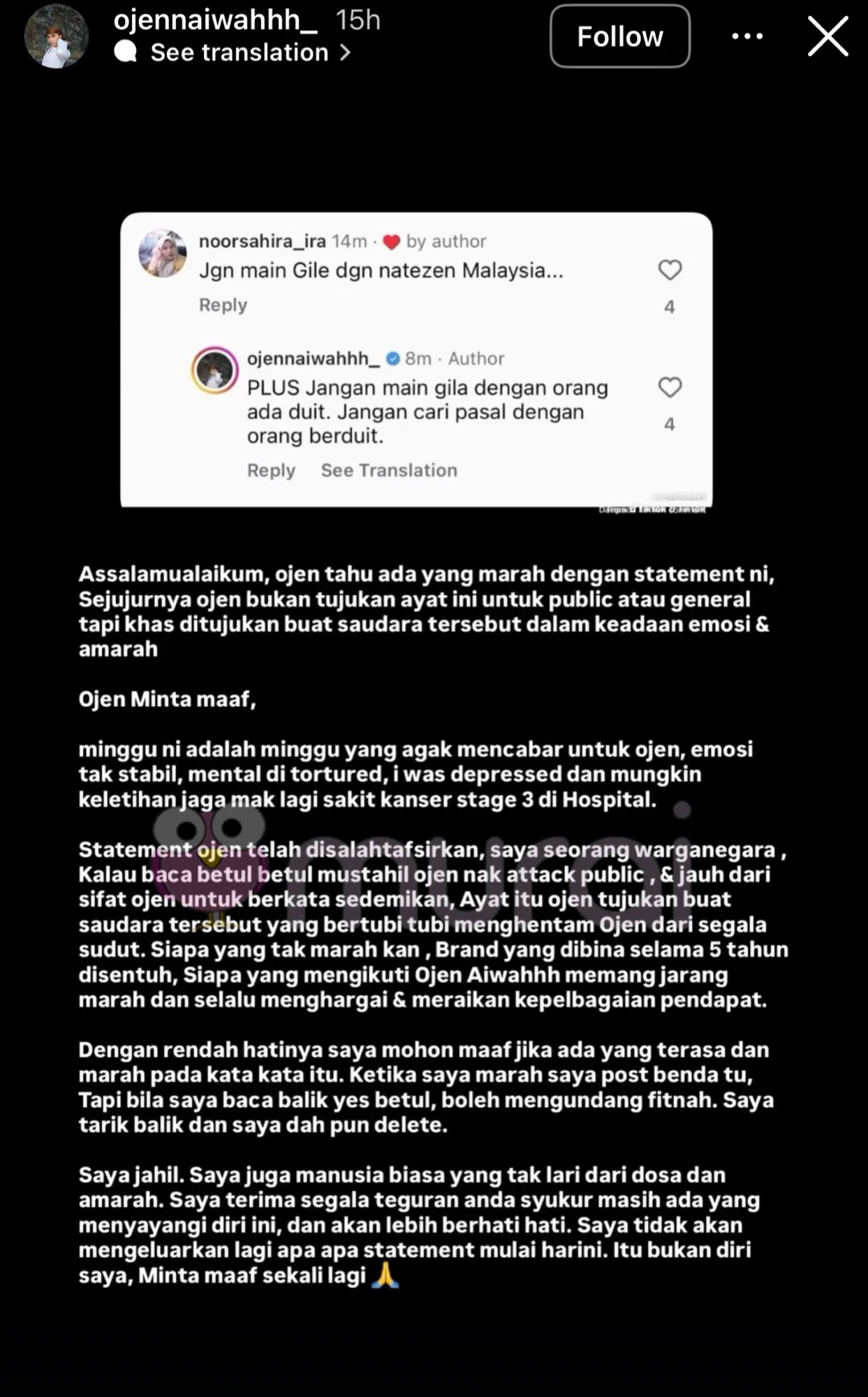 Dengan rendah hatinya, saya mohon maaf jika ada yang terasa dan marah pada kata-kata itu. Ketika saya marah saya post benda tu, tapi bila saya baca balik yes betul boleh mengundang fitnah. Saya tarik balik dan saya pun dah delete.”-tulis Ojenn di Instagram
