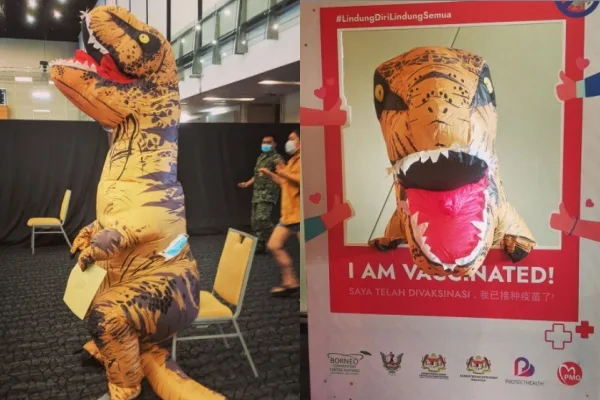 Penerima vaksin, Kenny Sia memakai kostum T-Rex di Borneo Convention Center Kuching (BCKK)