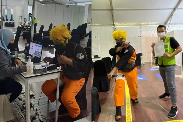 Seorang lelaki memakai kostum Naruto di Pusat Vaksinasi COVID-19 (PPV) Stadium Bukit Jalil