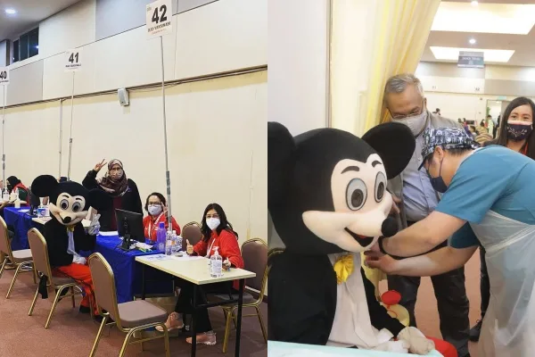 Di Universiti Malaysia Sarawak (UNIMAS) pula penerima vaksin yang memakai kostum Mickey Mouse telah melengkapkan dos keduanya