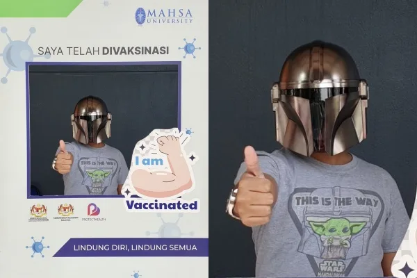 Manakala lelaki berpakaian sebagai Mandalorian pula ke Universiti MAHSA untuk menerima vaksin