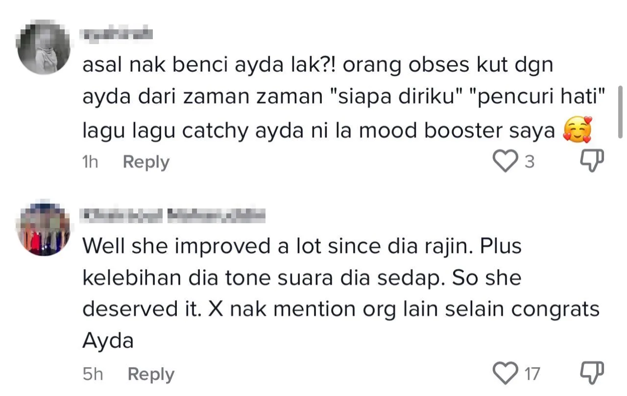 Menurut sebuah laman portal, Ayda pernah mengulas lanjut mengenai pengalaman beliau yang pernah menerima komen peminat dilaman sosialnya yang mengakui membenci personalitinya namun amat menyukai lagu nyanyiannya.