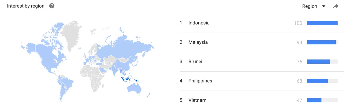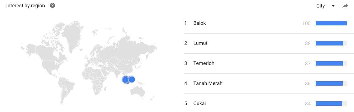 Data Google Trends setakat laporan ini ditulis menunjukkan carian paling banyak dibuat di bandar-bandar kecil iaitu Balok, Tanah Merah & beberapa bandar di Kelantan.