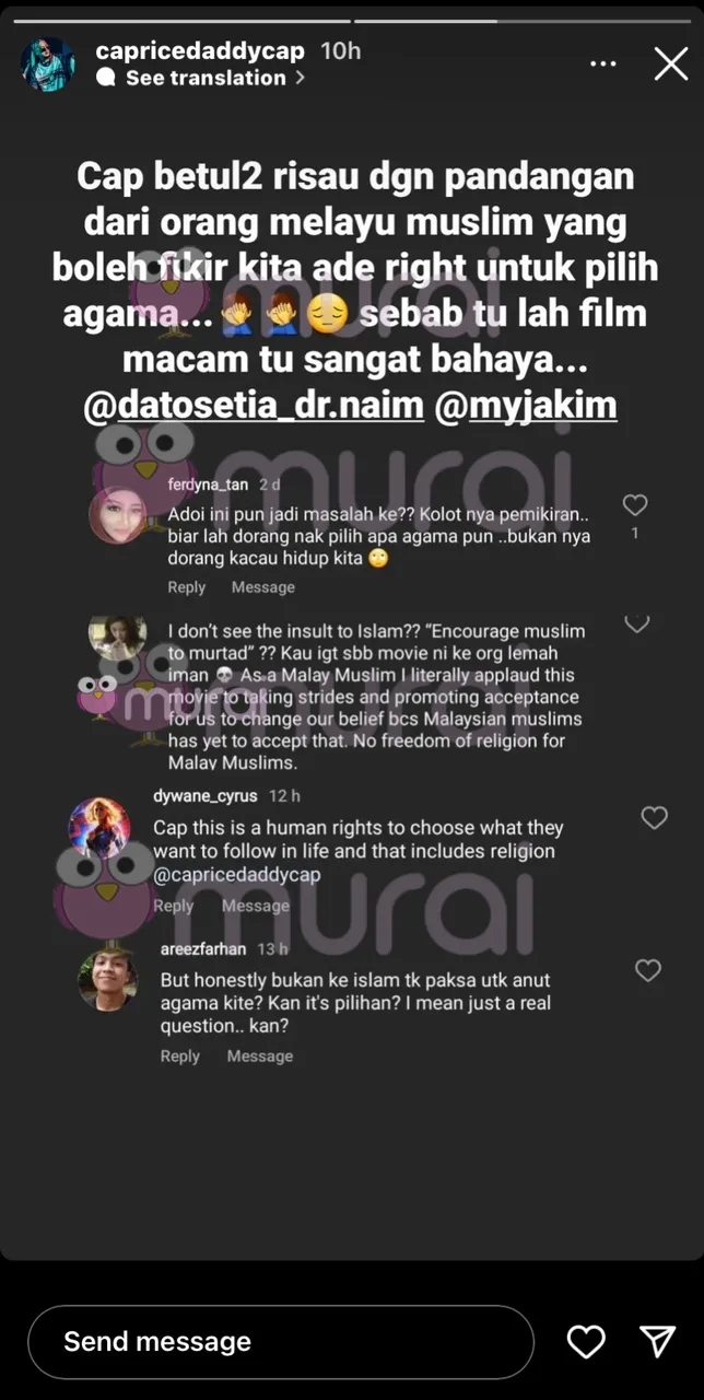 “Cap betul2 risau dgn pandangan orang melayu muslim yang boleh fikir kita ada right untuk pilih agama… sebab tu lah film macam tu sangat bahaya”.-Luah Caprice