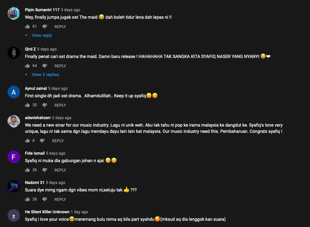 Lagu yang berentak pop’catchy’ serta menggabungkan pelbagai elemen tersebut mencuri perhatian ramai apatah lagi ramai yang tertanya sebelum ini mengenai penyanyinya. Bagi Syafiq sendiri, dia gembira kerana single pertamanya itu membuahkan hasil.