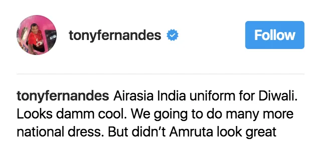 Seperti mana yang diumumkan oleh CEO AirAsia, Tony Fernandes di Instagram, seluruh krew penerbangan syarikat tambang murah AirAsia India ini akan menggunakan pakaian seragam baru. Krew Kabin akan mengenakan pakaian tradisional rakyat India iaitu Saree.