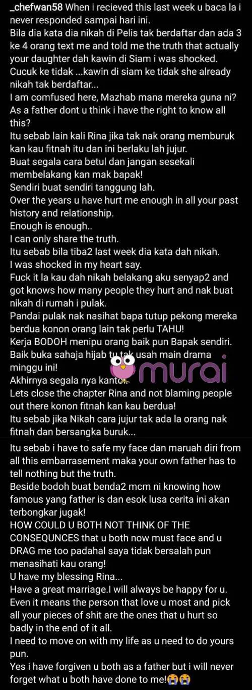 Dalam hantaran susulan, Chef Wan berkata dia tidak pernah menentang perkahwinan anak kesayangannya itu, sebaliknya hanya mahu menyiasat latar belakang bakal menantu sebelum berkahwin dan enggan mereka terlalu tergesa-gesa.