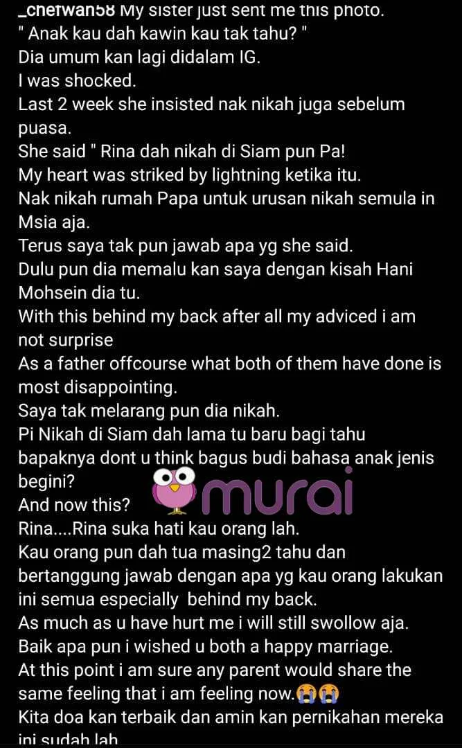 “Kakak saya hantar gambar ini sambil bertanya, adakah anak saya sudah berkahwin? Saya terkejut. Dia umum dalam Instagram. Dua minggu lalu, dia berkeras nak bernikah sebelum puasa. Dia kata dia dah nikah di Siam pun. Jantung saya bagaikan dipanah petir.