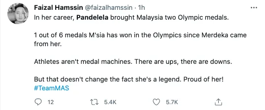 “Dalam kerjayanya, Pandelela membawa dua pingat Olimpik di Malaysia. 1 daripada 6 pingat yang dimenangi M’sia dalam Sukan Olimpik sejak Merdeka. Atlet bukan mesin pingat. Ada naik, ada turun. Tetapi itu tidak mengubah kenyataan bahawa dia legenda. Bangga dengan dia!”- tulis salah seorang rakyat Malaysia yang mendapat lebih dari 5k retweet.