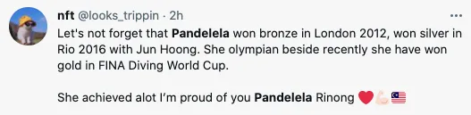 “Jangan lupa bahawa Pandelela memenangi gangsa di London 2012, memenangi perak di Rio 2016 bersama Jun Hoong. Baru-baru ini dia telah memenangi emas di FINA Diving World Cup.