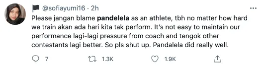 Seorang lagi pengguna twitter bernama @sofiayumi16 menulis, rakyat Malaysia tidak seharusnya menyalahkan Pandelela di atas kegagalannya. Ini kerana bukan mudah untuk seseorang atlet mengekalkan prestasi mereka.