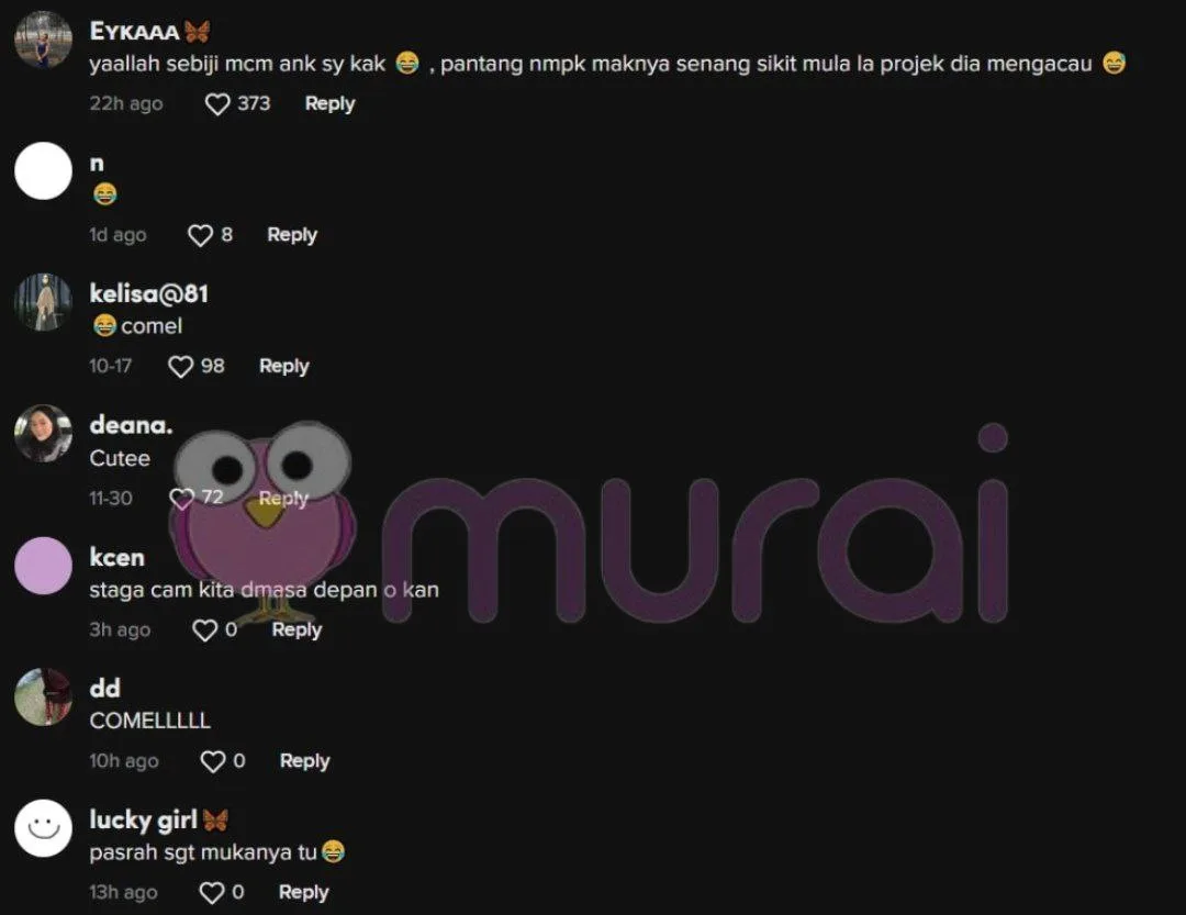 Hasil tinjauan Murai MY di ruangan komen tersebut, rata-rata peminat terhibur dengan gelagat mereka anak beranak yang menjadikan Zahirah sebagai track buat kereta mainannya. Ada juga yang mengatakan mereka turut sama merasakan apa yang Zahirah rasakan ketika dirumah.