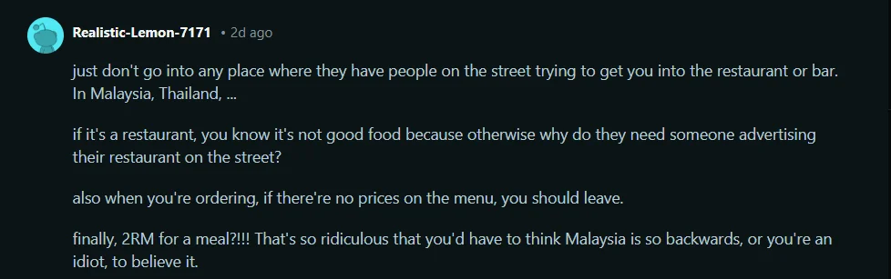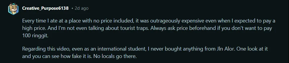 Ada yang berkongsi pengalaman dikenakan caj tinggi di premis yang tidak memaparkan harga pada menu. Seorang pengguna menyatakan dia mengelak daripada makan di lokasi tersebut kerana meragui ketelusan dan kualiti makanan.