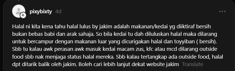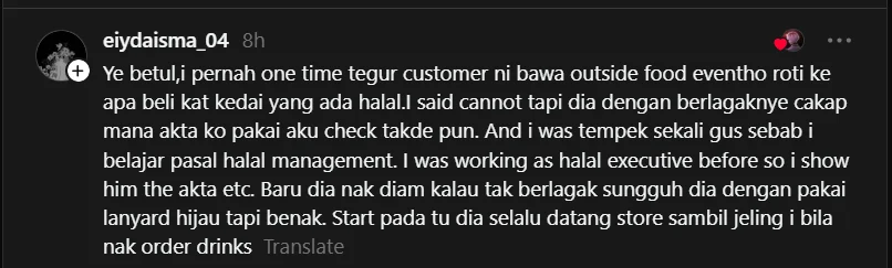 Dalam masa sama, terdapat juga individu yang berkongsi pengalaman pernah berdepan pelanggan yang mempersoalkan peraturan tersebut secara agresif sehingga memaksa staf menunjukkan garis panduan berkaitan pengurusan halal bagi menjelaskan situasi sebenar.