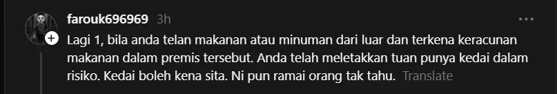 Menurut perkongsian seorang pengguna, sekiranya seseorang pelanggan mengalami keracunan makanan selepas makan di dalam premis, laporan kepada pihak kesihatan biasanya hanya merekodkan lokasi pelanggan makan.