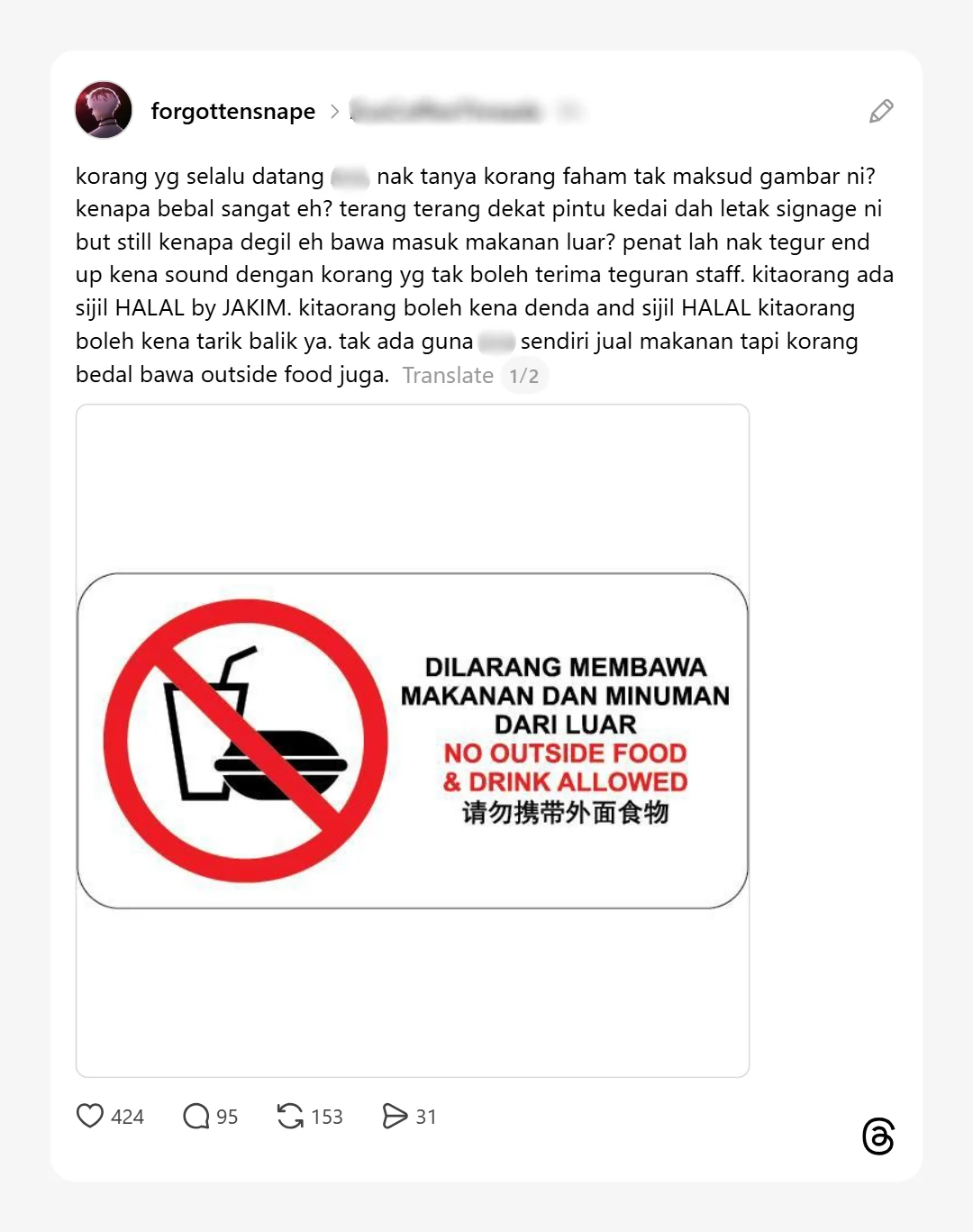Menerusi satu perkongsian di Thread, individu berkenaan meluahkan rasa penat apabila masih ramai pelanggan yang tidak mematuhi papan tanda larangan membawa makanan luar, walaupun notis tersebut dipaparkan jelas di pintu masuk premis.