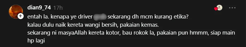 Malah, ada yang membandingkan kualiti perkhidmatan dahulu dan sekarang, daripada kenderaan yang bersih serta pemandu berpakaian kemas, kepada pengalaman yang dianggap kurang memuaskan dari segi kebersihan dan etika.