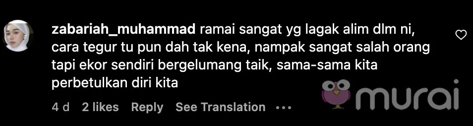Salah seorang peminatnya menegur para netizen berlagak ‘alim’ supaya berhati-hati dalam menegur orang lain.