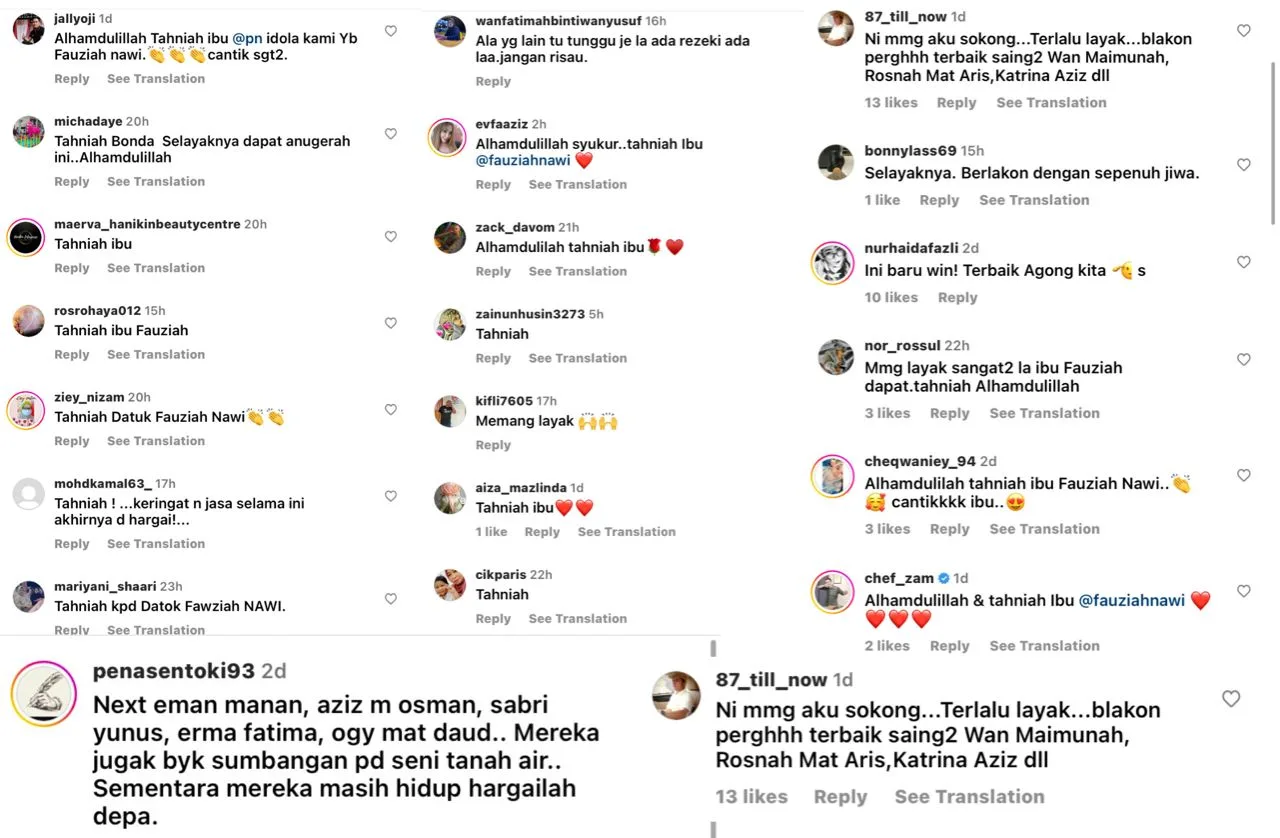 “Ni memang aku sokong, terlalu layak. Berlakon perghhh terbaik saing2 Wan Maimunah, Rosnah Mat Aris, Katrina Aziz dll”-kata mereka