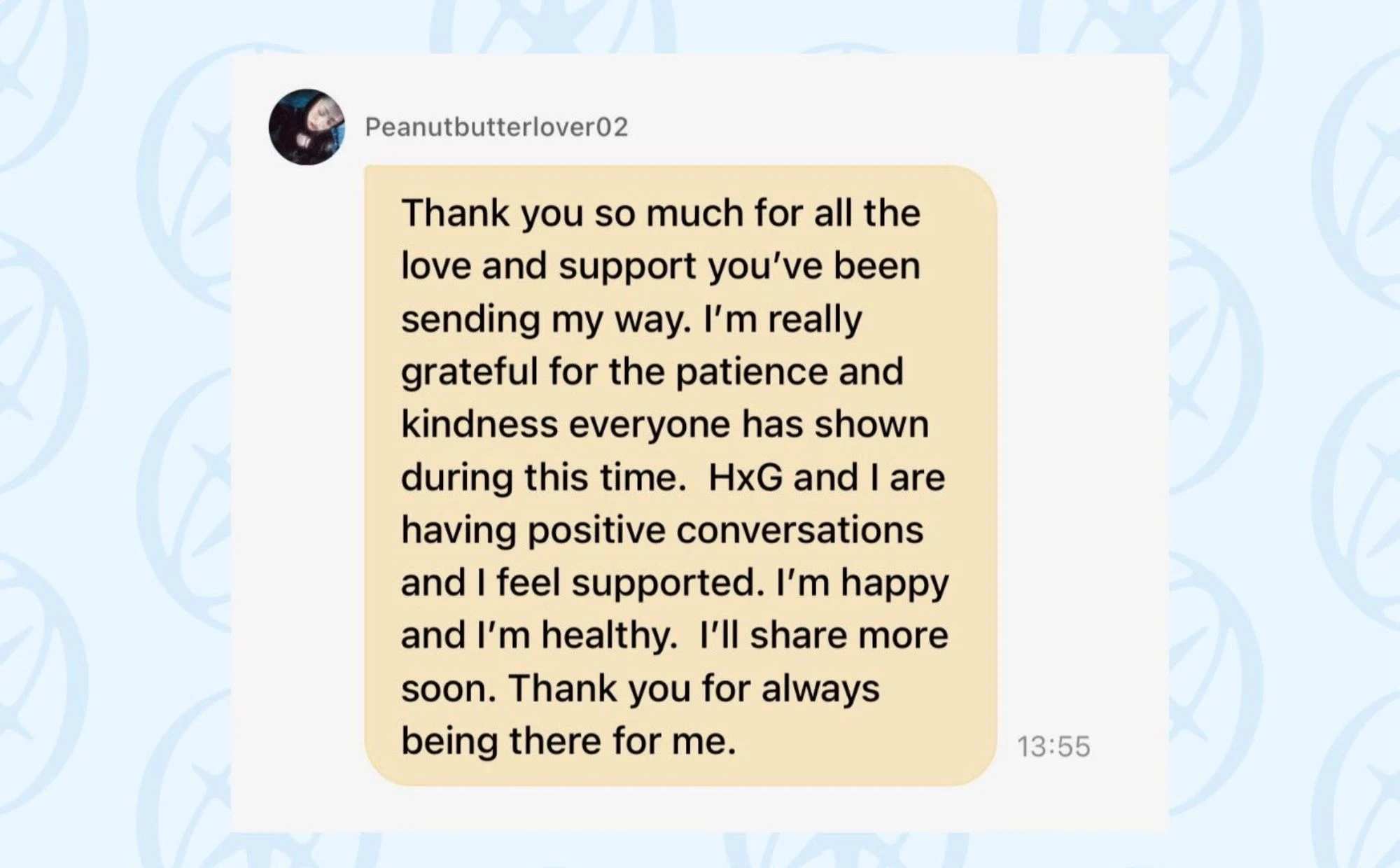 “Saya dan HxG sedang berbual secara positif, dan saya rasa disokong. Saya gembira dan sihat. Saya akan berkongsi lebih banyak lagi tidak lama lagi. Terima kasih kerana sentiasa ada untuk saya.”
