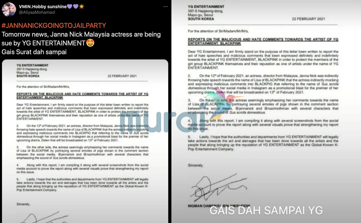 Sejak beberapa hari yang lalu, nama pelakon dan pengacara Janna Nick tular di media sosial berikutan dia dikatakan telah mempersendakan anggota kumpulan BLACKPINK, Lisa.