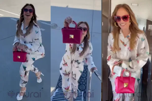Set persalinan pakaian tidur sutera putih dengan cetakan hummingbird yang dipakai Jennifer ini merupakan dari jenama Nahmias. Manakala beg tangan merah jambu yang dipegang penyanyi ini pula, dari koleksi Valentino Garavani One Stud.