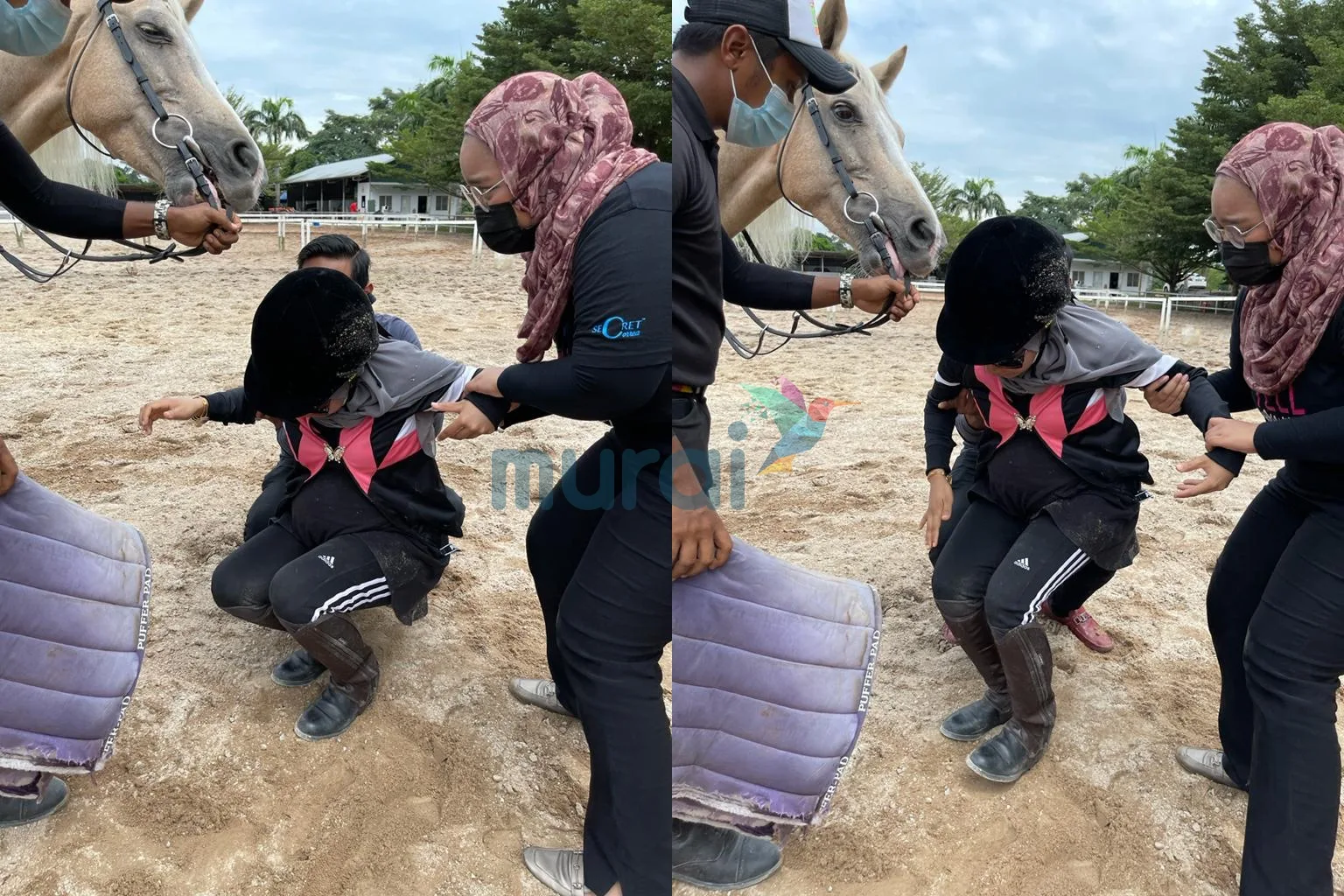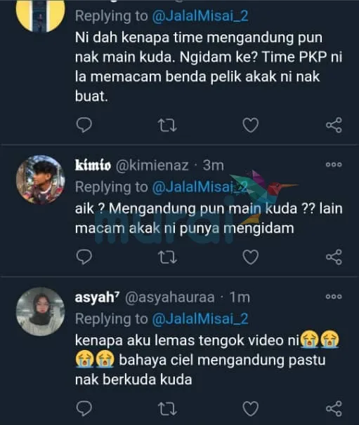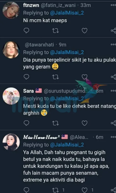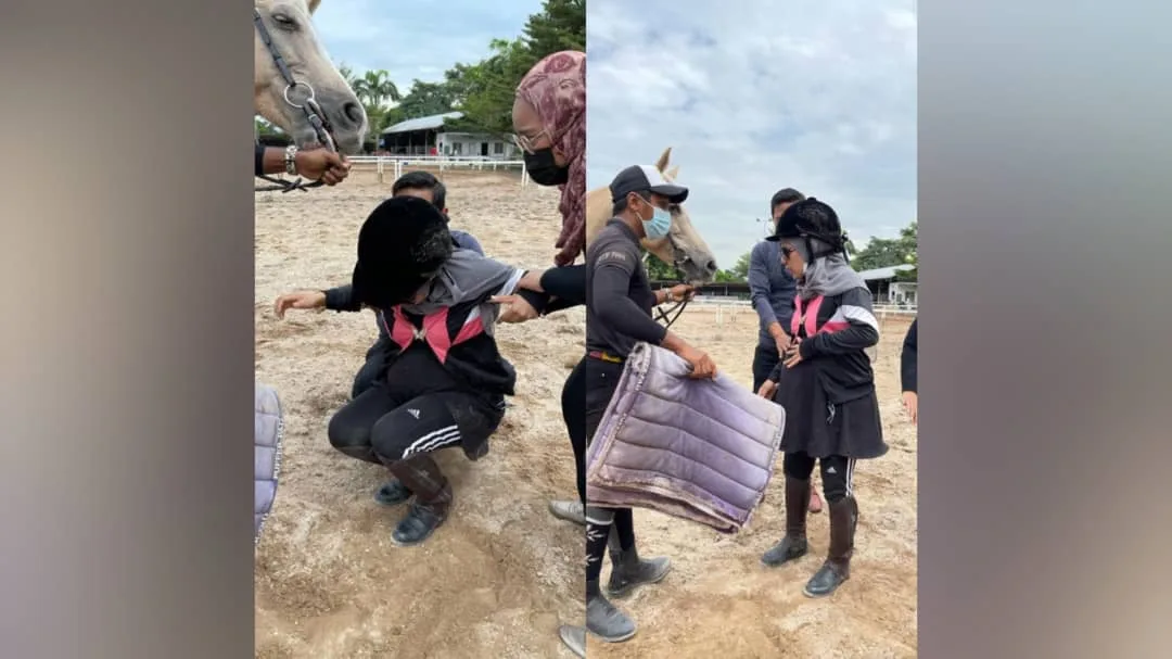 “Sebenarnya menunggang kuda ketika hamil ini bukan tak boleh tapi just kena berhati-hati.Macam dalam video itu sebenarnya saya override saja tapi berlaku sedikit kesilapan teknikal hingga tergelincir. Setakat pusing-pusing joy ride tak apa, melainkan trot@canter dalam arena memanglah tak sesuai dalam keadaan sarat macam ini”