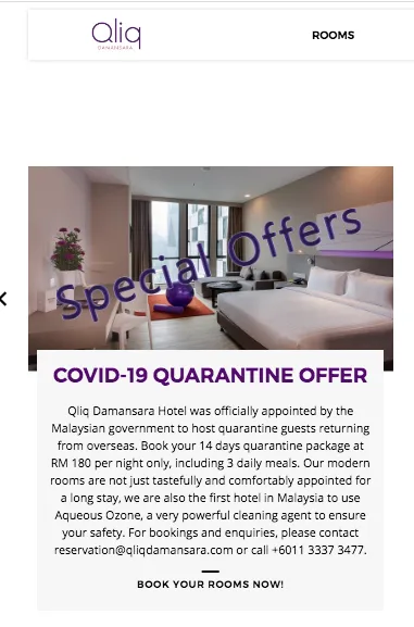 Walaubagaimanapun, menurut tinjauan Murai MY di laman sesawang, www.qliqhotels.com, pihak hotel ada menawarkan bayaran harga rata RM180 semalam untuk penginapan yang digunakan sebagai pusat kuarantin Covid-19.