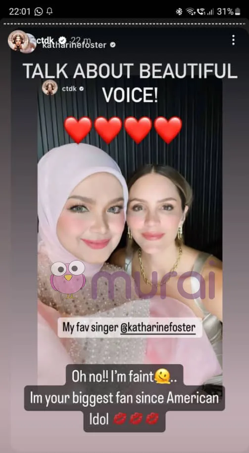 Dalam pada itu, Siti berkongsi semula pujian Kathaline dan mengakui bahawa dia begitu meminati Kathaline sejak dia memasuki rancangan American Idol. Untuk info, Katharine menjadi popular melalui rancangan realiti American Idol musim 5 dan mendapat tempat kedua dalam rancangan tersebut.