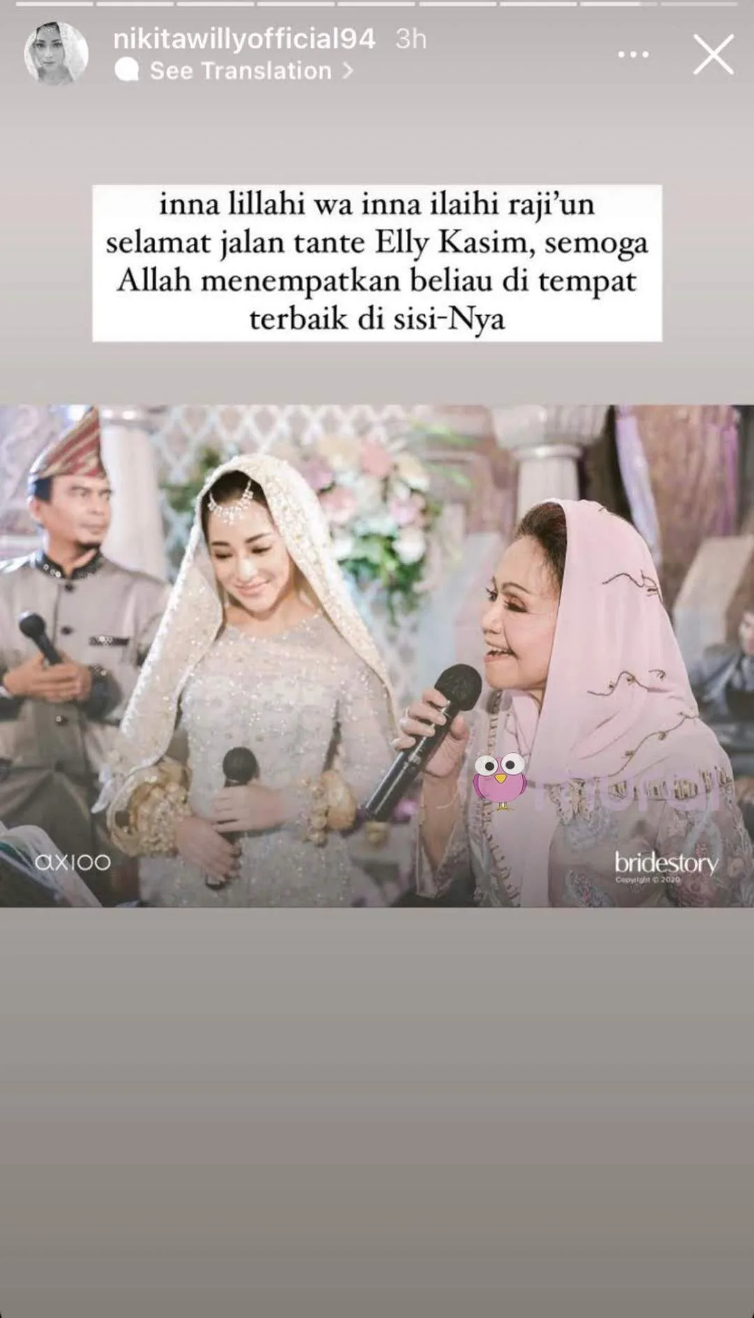 “Inna lillahi wa inna ilaihi raji’un selamat jalan tante Elly Kasim, semoga Allah menempatkan beliau di tempat terbaik di sisi-Nya.”- tulis Nikita