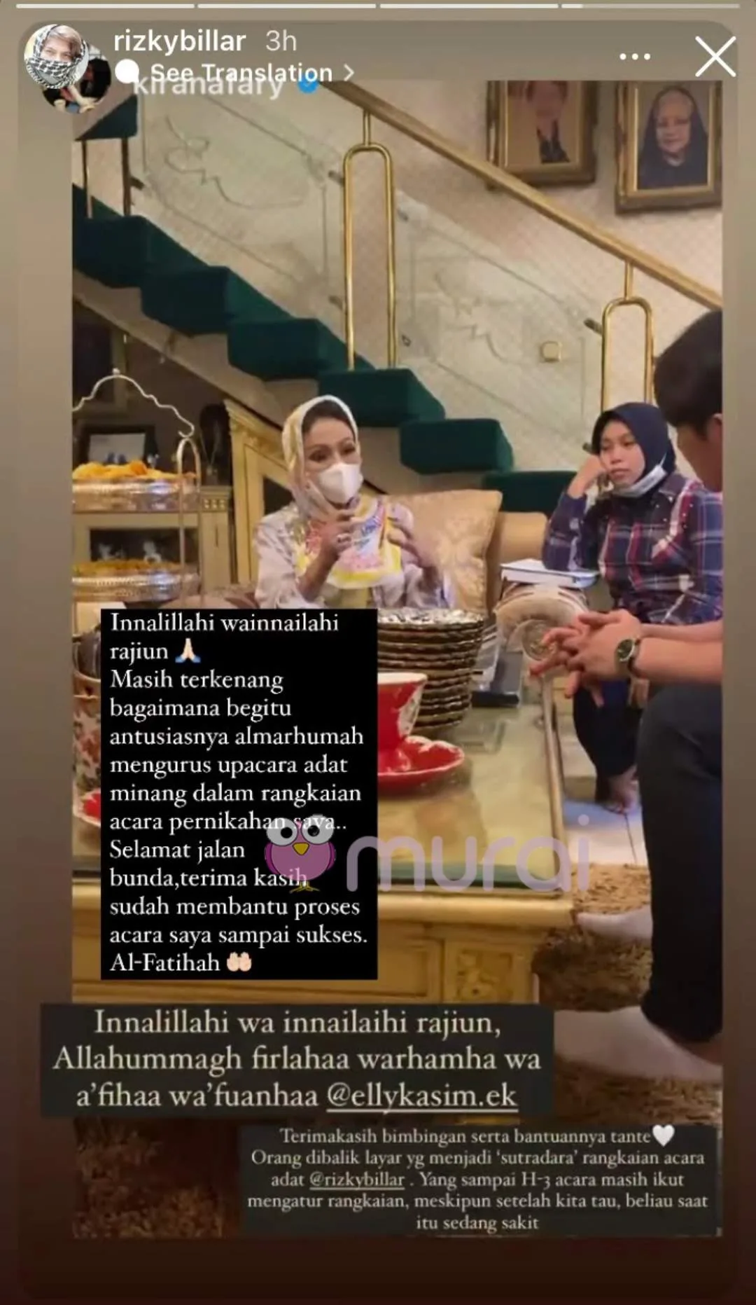 “Innalillahi wainnailaihirajiun. Masih terkenang bagaimana begitu antusiasnya Almarhumah mengurus acara adat minang dalam tangkaian acara pernikahan saya.. Selamat jalan bunda, terima kasih sudah membantu proses acara saya sampai sukse. Al-Fatihah.”- kongsi Rizky pula