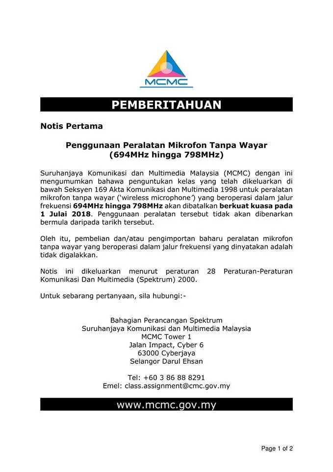 Sedikit pencerahan mengenai notis di atas: Jalur frekuensi 700MHz – 800MHz akan diperuntukkan bagi perkhidmatan jalur lebar mudah alih, LTE (4G). Penggunaan LTE dan mikrofon tanpa wayar dalam jalur frekuensi yang sama akan mengakibatkan gangguan kepada kedua-duanya. Maka, peranti-peranti tidak akan dapat berfungsi dengan baik. Mikrofon tanpa wayar boleh menggunakan jalur frekuensi yang telah disenaraikan pada Jadual ke-14 dalam Class Assignment No.1 of 2017 yang boleh diakses atau dimuat turun daripada laman sesawang MCMC di pautan berikut : https://mcmc.gov.my/…/pdf/Class-Assignment-No-1-of-2017.pdf
