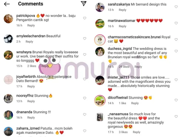 Diruangan komen posting pereka fesyen ini, ramai yang memberi komen dengan mengatakan, persalinan busana perkahwinan yang dipakai oleh pasangan diraja itu tampak gah dan menakjubkan kerana hasil sentuhan unik Bernard.