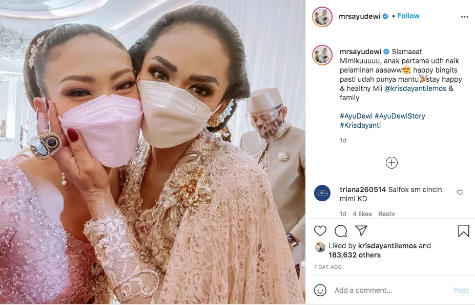 Melalui akaun Instagramnya, Ayu Dewi berkongsi foto dirinya dengan Krisdayanti. Dalam foto itu, wajah Ayu Dewi dan diva, yang dikenali sebagai KD, sama-sama melihat kamera. Walaupun mereka menggunakan topeng, ekspresi gembira dan senyum mereka dapat dilihat dari garis-garis wajah mereka.
