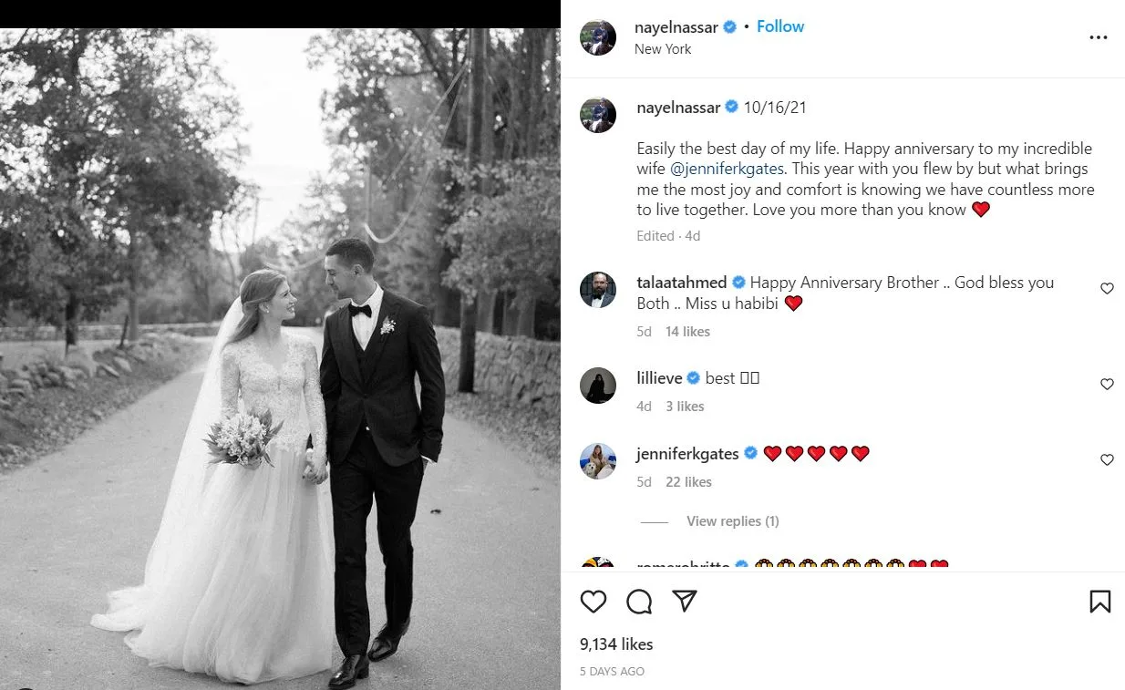 16 Oktober 2022, adalah hari yang menggembirakan bagi Jennifer Gates dan Nayel Nassar. Pasangan muda itu baru sahaja menyambut ulang tahun perkahwinan pertama mereka.