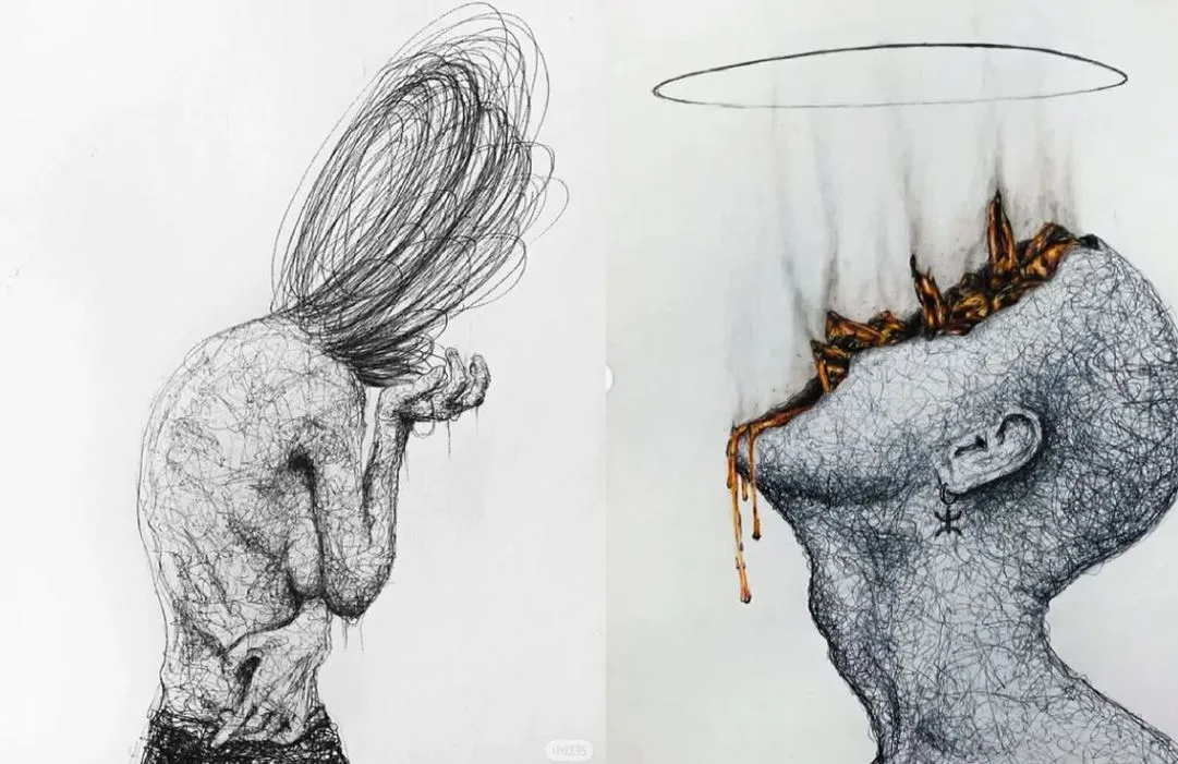 Turut dikongsikan, ilustrasi suasana gelap, sosok bayangan hitam serta imej menggambarkan minda yang kosong dan semuanya membawa aura suram.