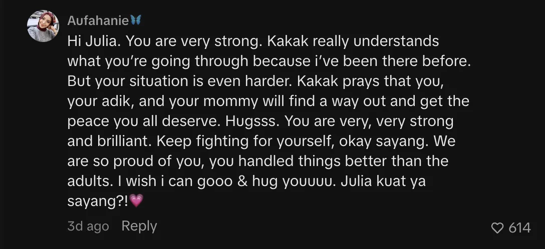“Hi Julia. Awak seorang yang sangat kuat. Kakak benar-benar faham apa yang awak sedang lalui kerana kakak sendiri pernah melalui situasi yang sama sebelum ini… tetapi situasi awak lebih mencabar.